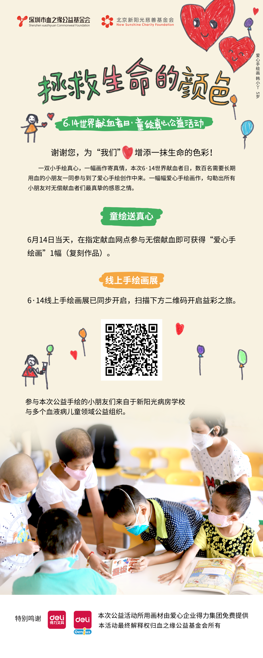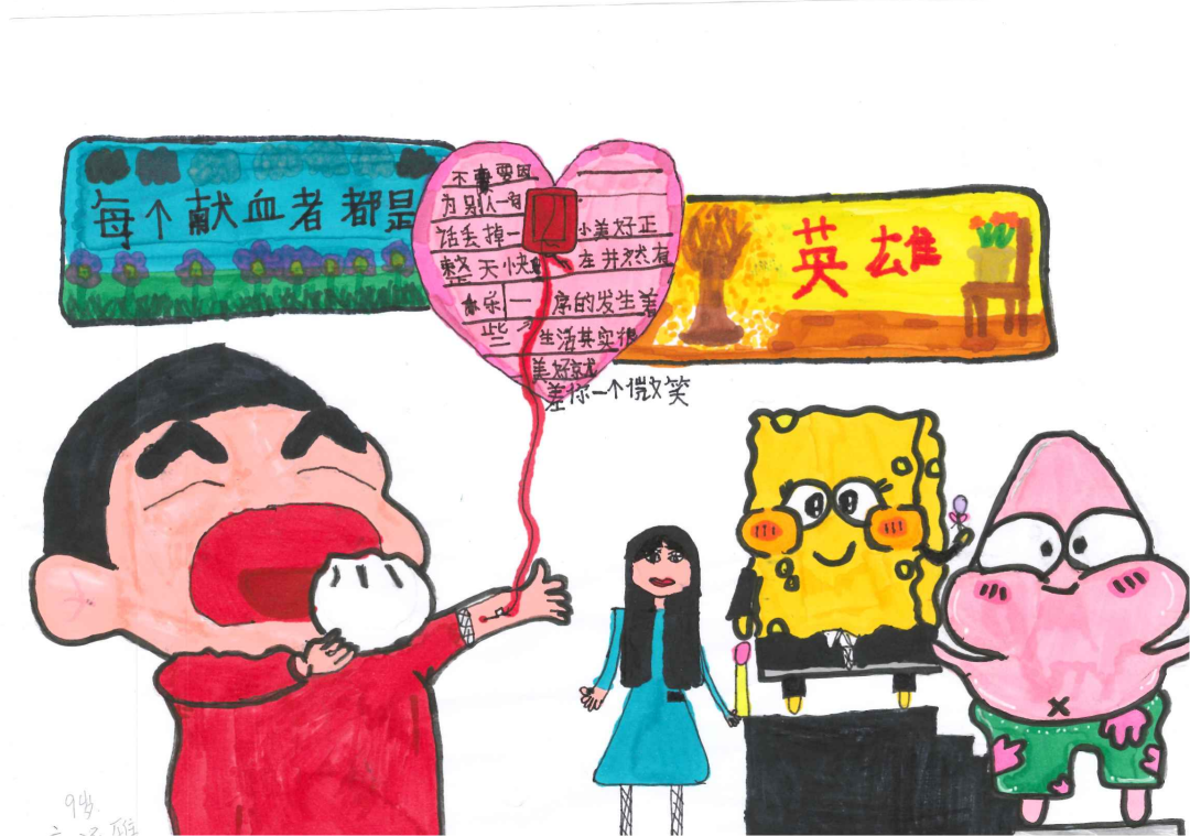 手绘作者是来自“新阳光病房学校”需要长期用血的小朋友,他们用小手勾勒出他们对无偿献血者的真挚、天真、纯净的情感,也代表其他需要用血的朋友们向无偿献血者表达感恩之情。